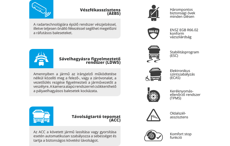 Az Inovell + vázszerkezete teljesíti a legszigorúbb, ENSZ EGB R66.02 szerinti szilárdsági követelményeket, utasülései pedig hárompontos biztonsági övvel vannak felszerelve. A járművezető világszínvonalú vezetéstámogató rendszerekre támaszkodhat, amelyek szükség esetén aktívan beavatkoznak a balesetek elkerülése, vagy súlyosságuk csökkentése érdekében.